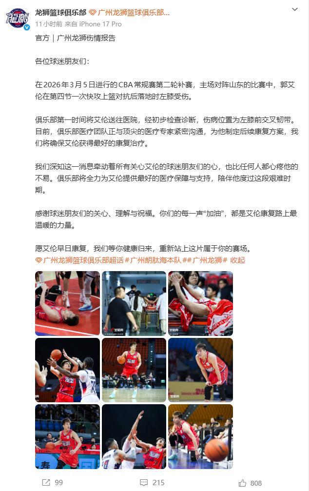 赛后第一时间,广州队就发布了声明,广州队表示:“各位球迷朋友们,俱乐部第一时间将艾伦送往医院,俱乐部医疗团队正与顶尖的医疗专家紧密沟通,为他制定后续康复方案,我们将确保艾伦获得最好的康复治疗。我们深知这一消息牵动着所有关心艾伦的球迷朋友们的心,也比任何人都心疼他的不易。俱乐部将全力为艾伦提供最好的医疗保障与支持,陪伴他度过这段艰难时期。愿艾伦早日康复,我们等你健康归来,重新站上这片属于你的赛场。”此外,广州队还感谢球迷朋友们的关心、理解与祝福。